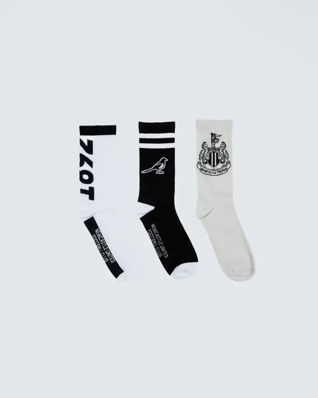 Celebrate the rich heritage of Newcastle United with this 3 Pack of socks, each featuring a unique NUFC graphic – from the iconic magpie to the classic club crest and a nod to the club’s historic roots. With black, grey, and white colourways, this set is perfect for everyday wear, match days, or as a thoughtful gift for any dedicated supporter.