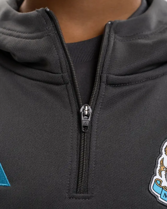 Designed for our young players to wear around the training ground, this regular-fit hooded track top is packed full of sweat-wicking properties to deliver post-training comfort and optimum recovery. This eye-catching hoodie showcases adidas’ classic 3-bar logo, 3-Stripe tape detail, and our iconic heat-applied Newcastle United Club crest.
