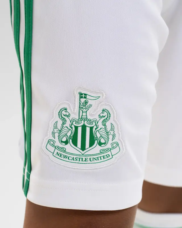 Complete the Away Kit with the Newcastle United adidas Kids 25/26 White Away Shorts. Designed to be eye-catching, the green detail in the iconic Newcastle United Club crest and adidas’ 3-Stripes boldly stand out atop the white shorts, confidently completing our Tyne Bridge inspired kit.