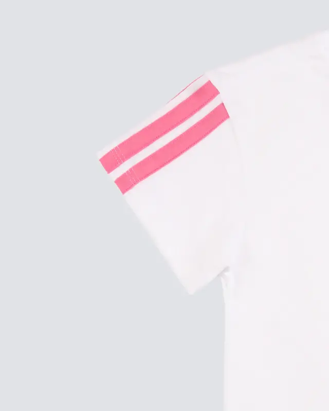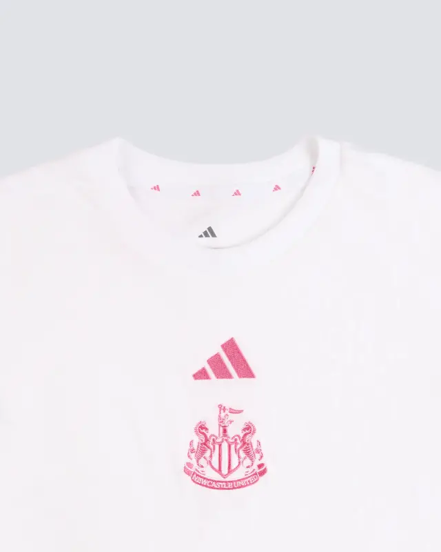 Add a fresh pop of color to your little fan’s wardrobe with the Newcastle United adidas Kid’s White & Pink T-Shirt. Designed with signature pink adidas 3-Stripes down the shoulders, this crisp white tee also features the adidas logo and NUFC crest on the chest – perfect for showing team pride with a bold, playful twist.
