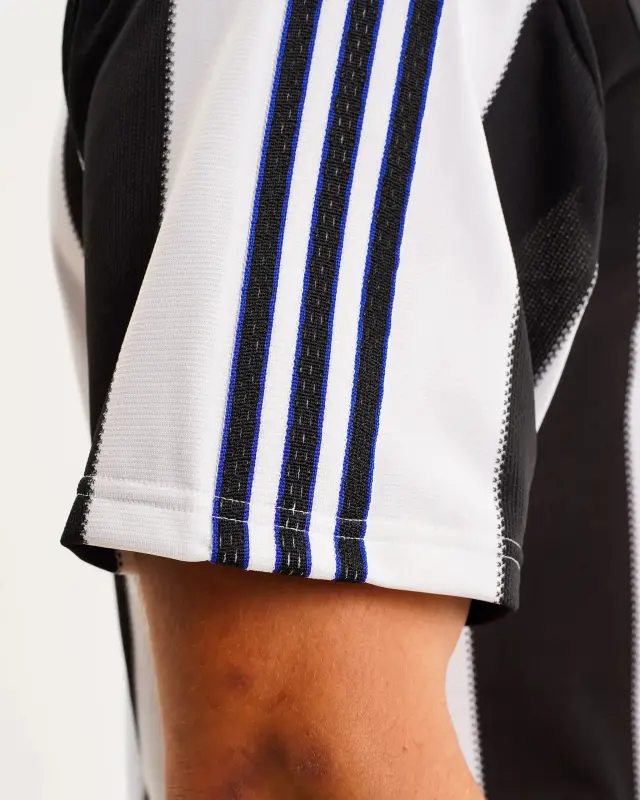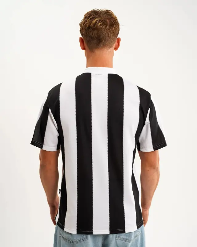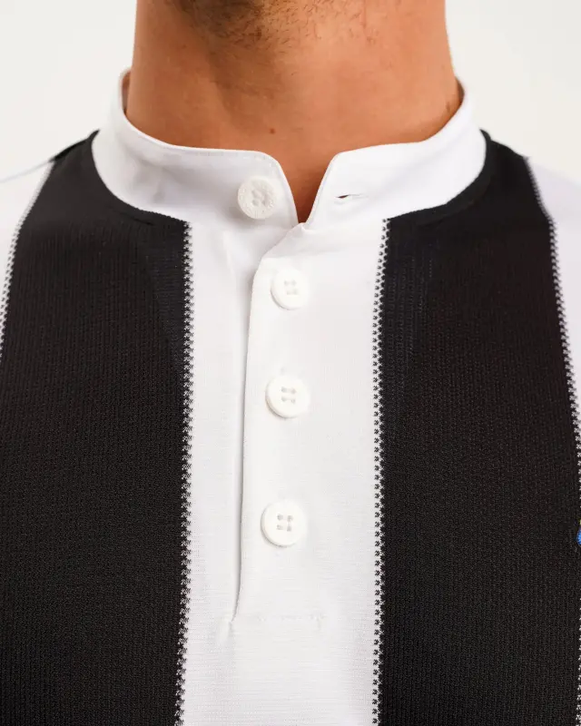 Significant for being our first adidas shirt, the design features a vintage Grandad collar and evenly spaced black and white stripes. Completed with the vibrant Newcastle Brown Ale sponsor, the touch of orange complements our traditional monochromatic look.