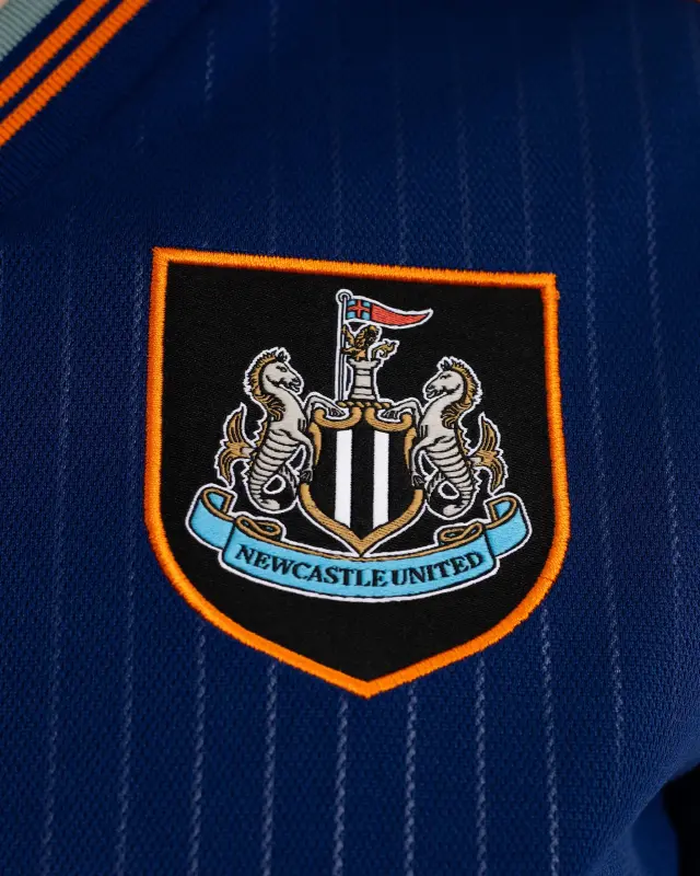 Unexpected, Fresh, and a Newcastle United First. This shirt features an embroidered adidas trefoil logo, a sewn-on club crest encased in a black shield, and a vibrant orange 1980’s club crest on the back of the neck. The V-neck collar and subtle pinstripes give the shirt the elegance to be an icon of both the past and the future.