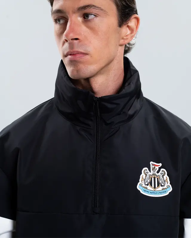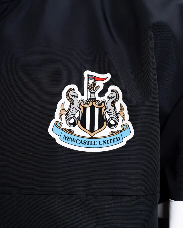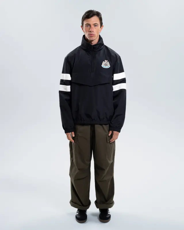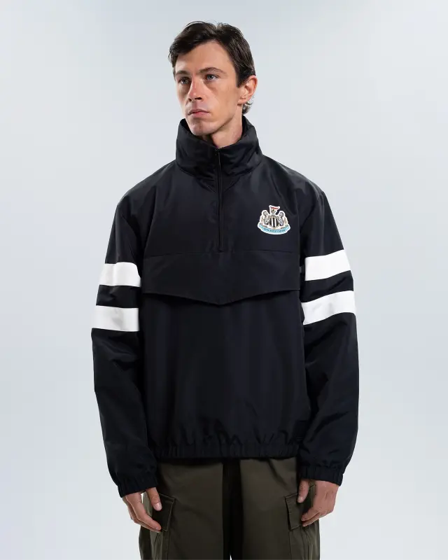 The Newcastle United Black Quarter Zip Cagoule is a lightweight essential that brings subtle style to everyday wear. It features a clean quarter-zip design with a hidden hood, practical front pockets, and bold white stripes running down each arm. Finished with the NUFC crest on the chest, this is a versatile layer that lets your support stand out — on matchday or any day.