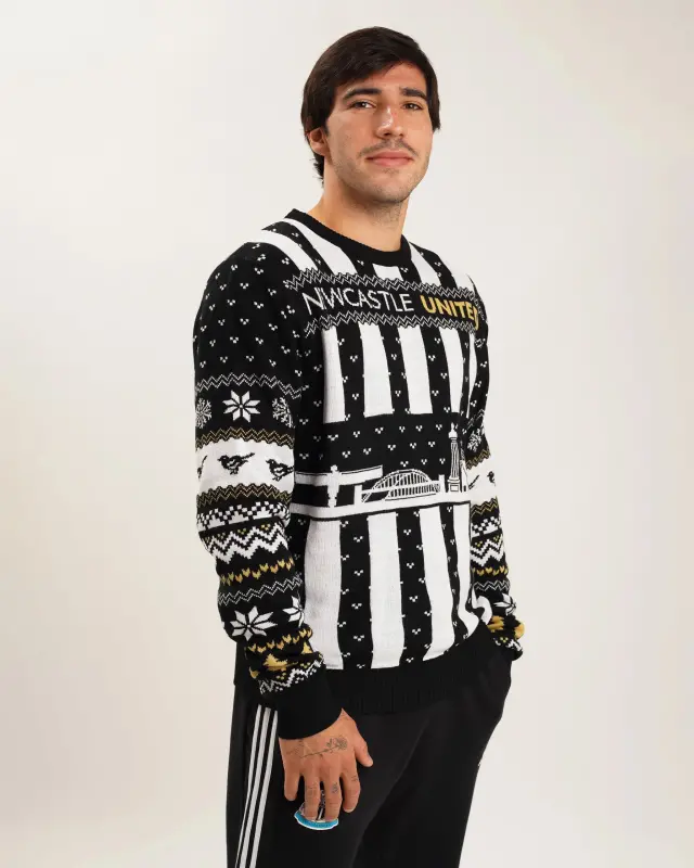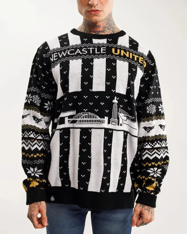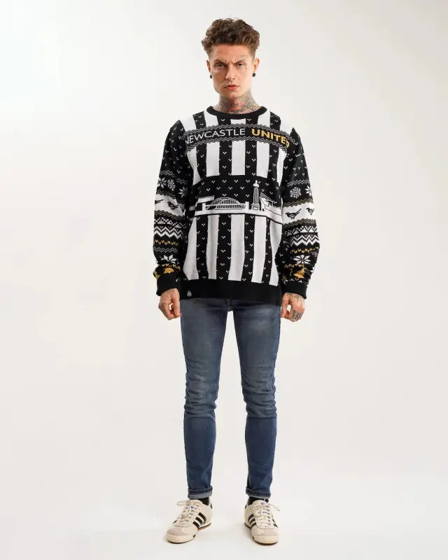 The Newcastle United Howay The Lads Christmas Jumper is a festive take on our renowned black and white stripes. Featuring Newcastle’s iconic skyline, mini magpies and “Ho Ho Howay The Lads” text on the back, this is a Christmas must-have for all the family.