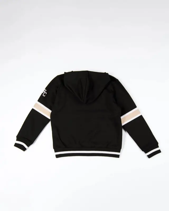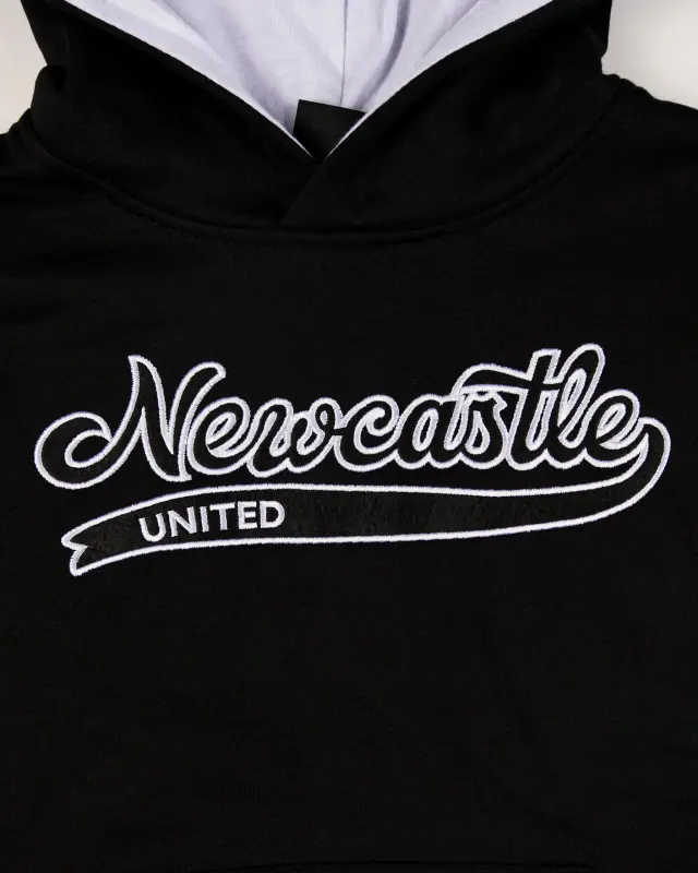 The Newcastle United Kids’ Black Collegiate Hoodie is a everyday wear to keep your little one stylish and warm. This all black hoodie features “Newcastle United” text in a collegiate-style font and American influenced stripes around the elbow, cuffs and hem. With a full sized hood, and ribbed cuffs and hem, your kid will stay cosy throughout the season.