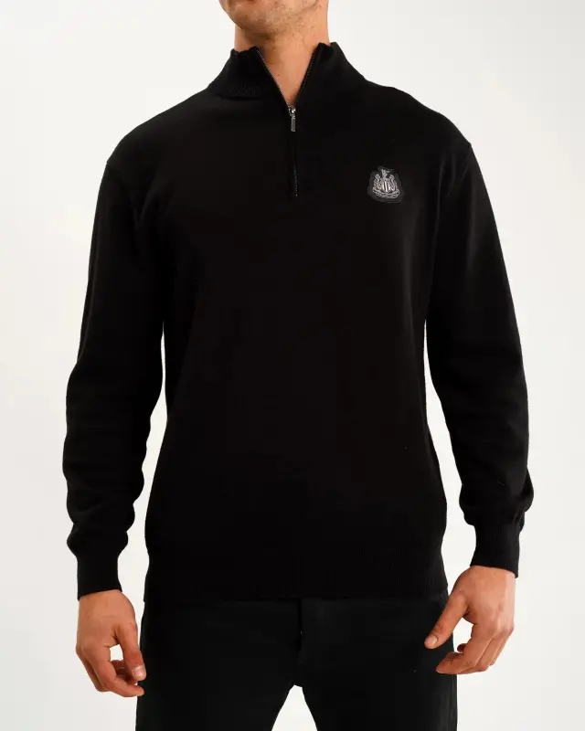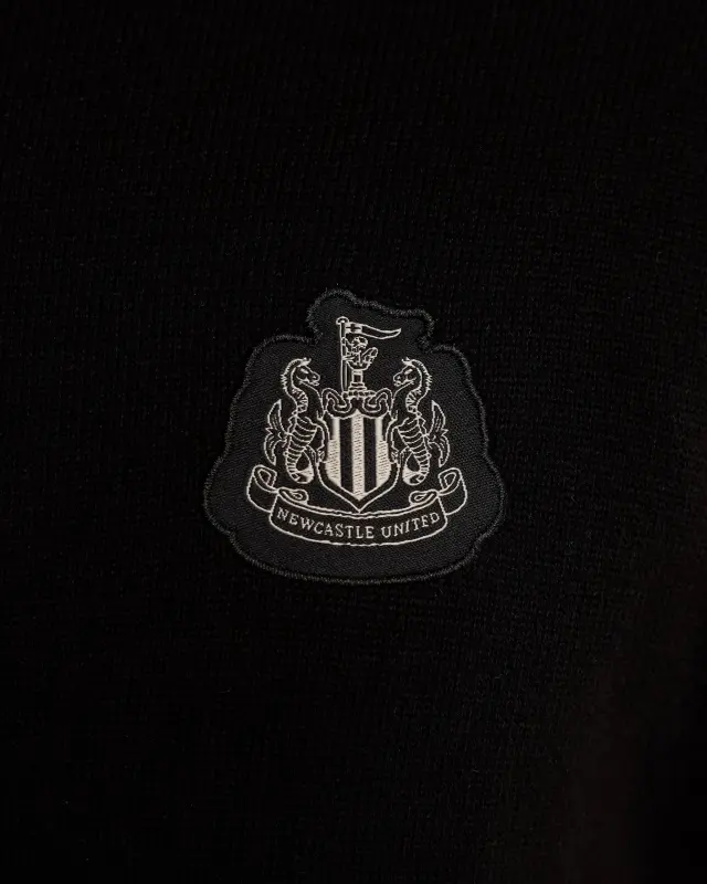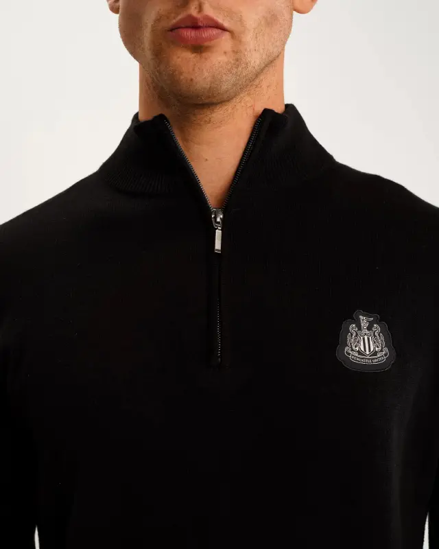 The Newcastle United Men’s Black Cotton Half Zip Knitted Sweater is a comfy way to dress up any outfit. Designed with a stand up collar and ribbed cuffs and hem, this knitted sweater is crafted to keep you warm while showing off your Tyneside pride.