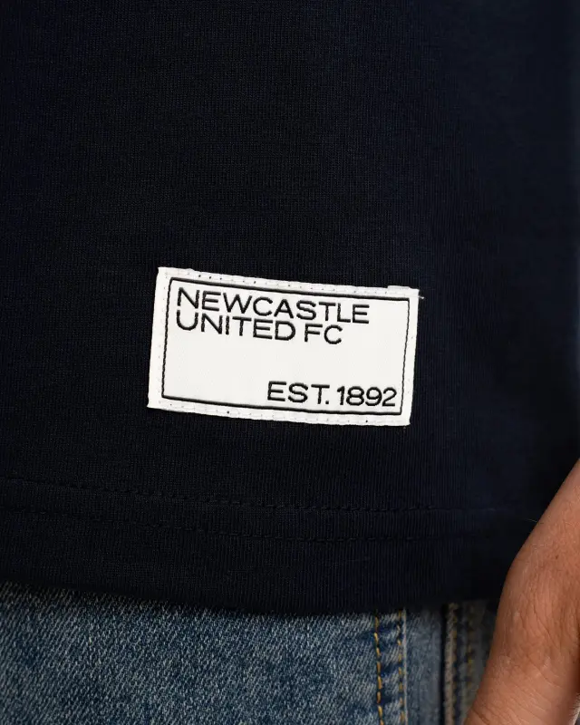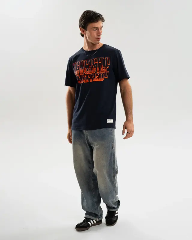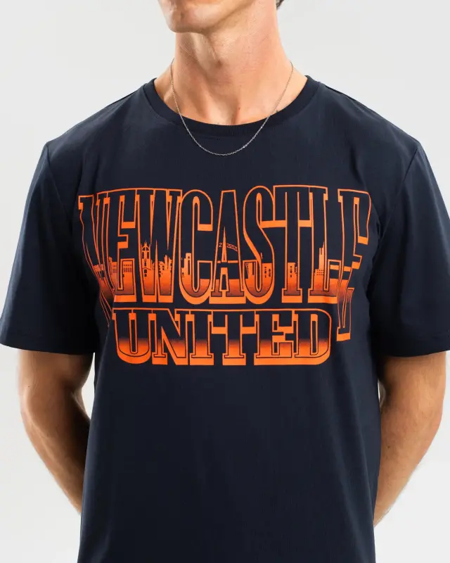 Celebrate your team in style with the Newcastle United Navy Graphic T-Shirt. Featuring a bold chest print in striking red and orange hues, this tee makes a statement wherever you go. The deep navy base provides a sleek contrast to the vibrant graphic, while a subtle branded tag at the hem adds a refined finishing touch.