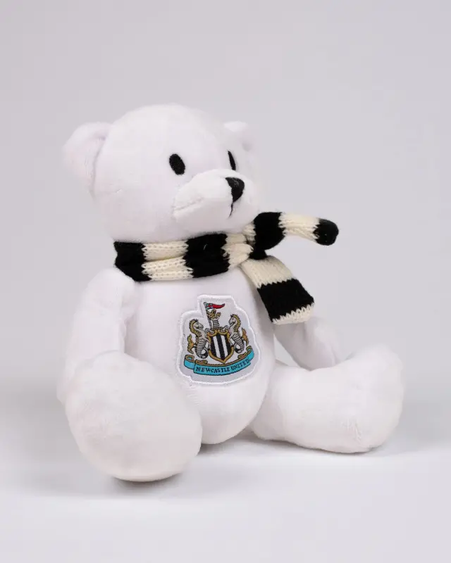 Introducing the Newcastle United White Maisie Bear. A furry friend with a bold Newcastle United Club crest on his belly to remind you of your Magpies family!